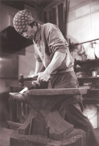 In 1979, he became attracted to the "primitive" act of striking iron, and this led him down the path of the blacksmith. He set up shop in 1986, and since then has produced various works (mostly candlestands) on the theme of "fire." His works have been displayed at galleries all over Japan, and he has had joint exhibitions with artists of various genres including Sachiko Adachi, Mayumi Mori, Miyuki Hasekura, dye artist Hiroshi Saito, shikishi artist Daikei Tachibana and doll artist Shizuyo Ogawa. He continues to the possibilities of his artform in the context of modern space design. |